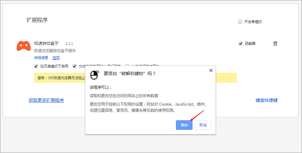目前破解右键锁插件支持360极速浏览器、谷歌浏览器、alook浏览器、荟萃浏览器、百分浏览器,以及firefox火狐浏览器等等,可以满足更多用户使用不同浏览器的需求,并且操作起来也是十分的方便,你只需要将插件移动到扩展程序界面中,点击添加,即可使用,有需要的朋友欢迎下载体验。
