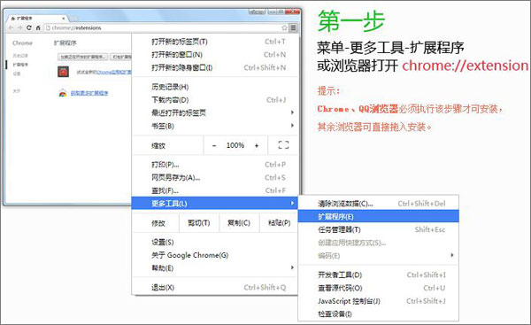 1、菜单-更多工具-扩展程序 或浏览器打开chrome://extension