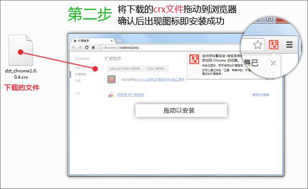 2、将下载的crx文件拖动到浏览器 确认后出现图标即安装成功