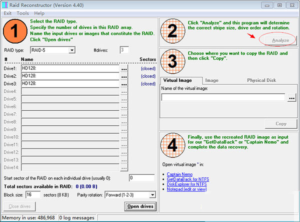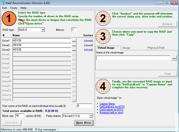 Runtime RAID Reconstructor对损坏的RAID-0和RAID-5阵列进行存储,分别由2到16个或3到16个驱动器组成。允许RAID-5阵列缺少一个驱动器。