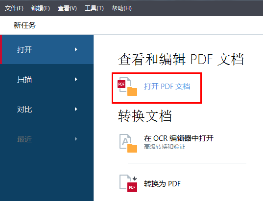 打开软件,点击左侧菜单栏中的“打开”菜单,其中有“打开pdf文档”项,点击导入目标文档。