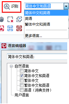 4、当然,如果文档中除了简体中文和英语外,还有其他语言没有被识别出来,那么也可以点击菜单栏中“识别”项,选择目标语言。还可以点击“更多语言”,进入“语言编辑器”选择语言。