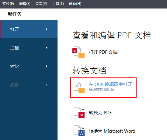 1、打开软件,点击左侧菜单栏中的“打开”,其中有“在OCR编辑器中打开”项,点击后选择目标文档导入。