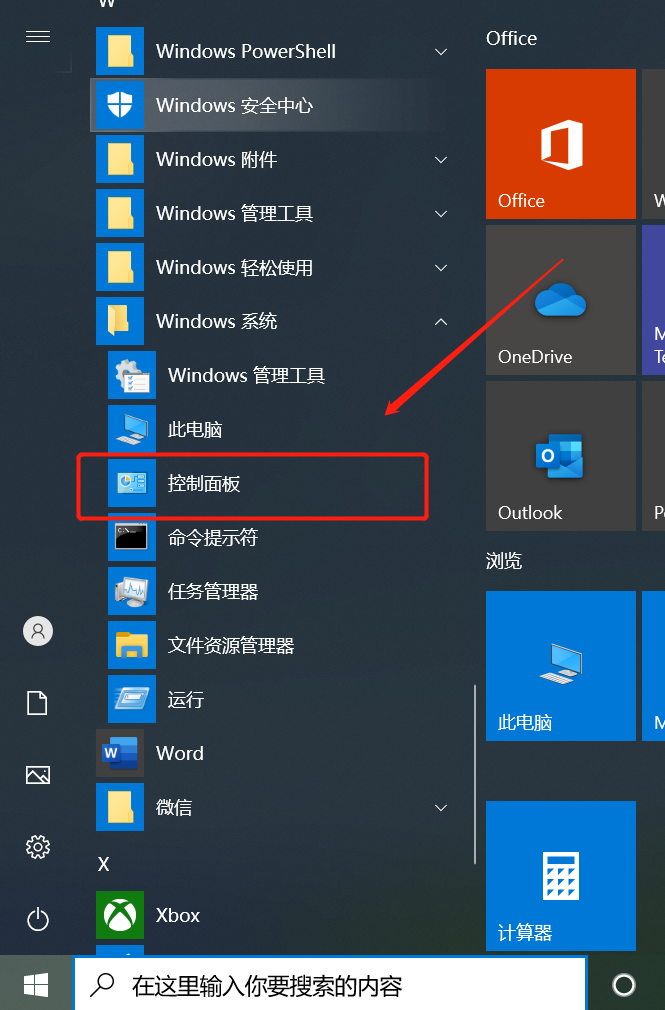 1、打开开始菜单,点击进入Windows系统文件夹里的控制面板