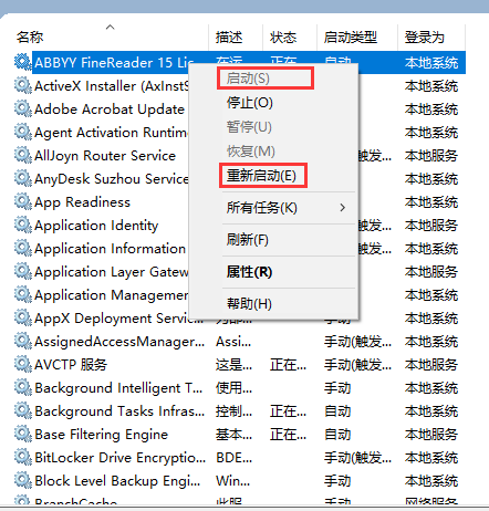 8、在服务对话框中,右击ABBYY FineReader 15 Licensing Service,在快捷菜单中选择启动或重新启动