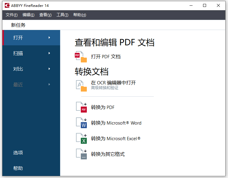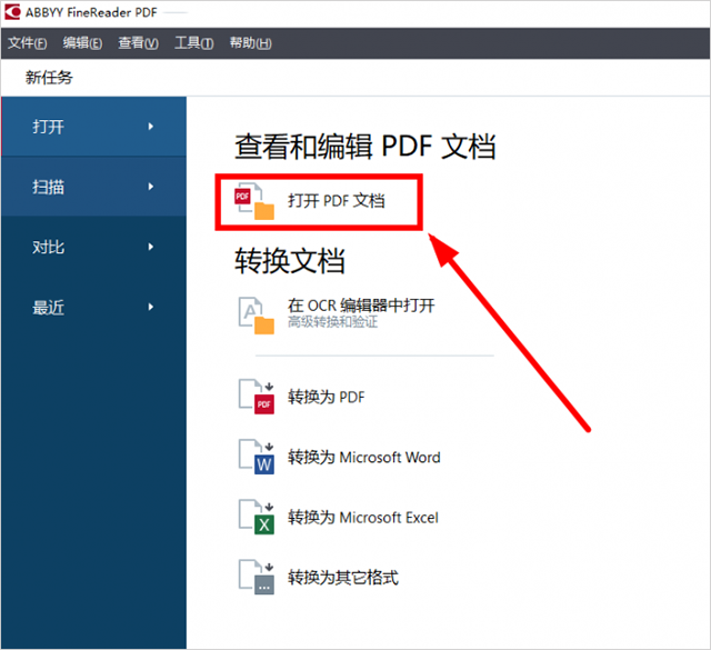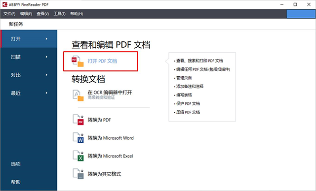 如需ABBYY FineReader PDF 15的PDF编辑功能,需在首页单击“打开PDF文档”使用。