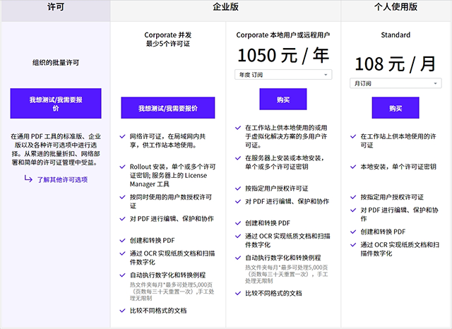 组织的批量许可:在通用 PDF 工具的标准版、企业版以及各种许可选项中进行选择。从累进的批量折扣、网络部署和简单的许可证管理中受益。