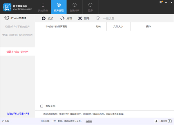 温馨提示:酷音苹果助手读取的APP下载的歌曲针对的安装了酷音铃声APP的宝宝。如果宝宝手机上没有“酷音铃声”,你也可以在酷音苹果助手的【在线铃音】页面下载喜欢的铃声设置成铃声。