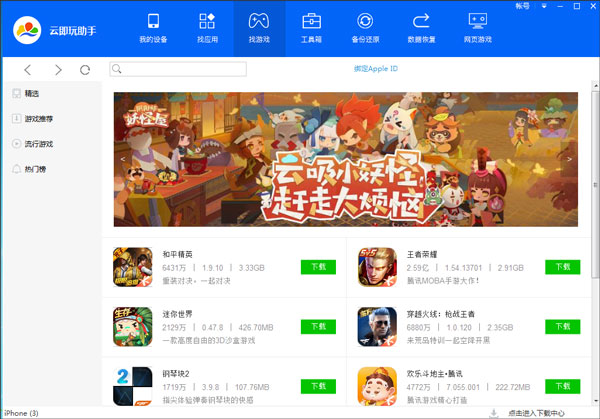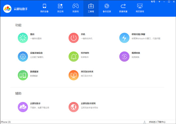 云即玩助手电脑版是一款功能强大,且非常实用的苹果设备同步管理软件,该软件有着设备管理 、找应用、找游戏、工具箱、备份还原、数据恢复、网页游戏等诸多功能,既能帮助用户轻松管理苹果设备中的照片、视频、应用、音乐、电子书等数据文件,又能为用户提供许许多多的应用和游戏。因此如果当你的苹果设备出现损坏/丢失/碎屏、忘记锁屏密码、文件/数据误删等多种情况,那么这款软件还可以帮助你进行快速恢复哦,欢迎有需要的用户们免费下载体验!