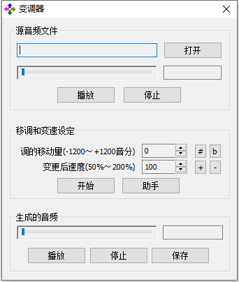 音乐变调器是一款简单易用的音乐变调软件,它可以减缓音乐或加快音乐,若点击上或者下能够可更改音乐的音调,目前只支持MP3和WAV文件,感兴趣的朋友可下载收藏。打开文件后,按“#”,“b”设定变调的半音个数。一个半音为100音分。然后按“开始”按钮。变完以后可以听一下,如果没有问题,就可以保存了。