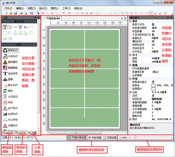 6、丰富的标签元素支持:文本、文本链(文本的组合)、自动文本(通过规则定义使每一张标签按一定的规则变化)、直线、折线、框、圆、多边形、图片等元素;