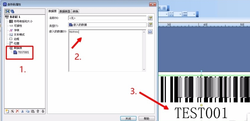2、接着在条形码上右击鼠标,并在出现的下拉框中点击“属性”,界面上就会弹出一个条码属性设置窗口;在窗口左侧找到“数据源”并点击,之后在窗口右侧“嵌入的数据”文本框中设置好条码编号模板。