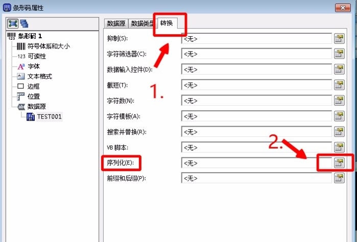 3、然后在条形码属性窗口的顶部找到“转换”按钮,我们点击该按钮,其下方会出现相应的操作选择,在窗口下方找到“序列化”选项,点击其后面的设置按钮进入到序列化设置窗口。