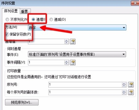 4、在序列化设置窗口中,在窗口上方找到“递增”并点击,并在“方法”选项后面的下拉框中选择“数字”,同时勾选“保留字符数”选项。