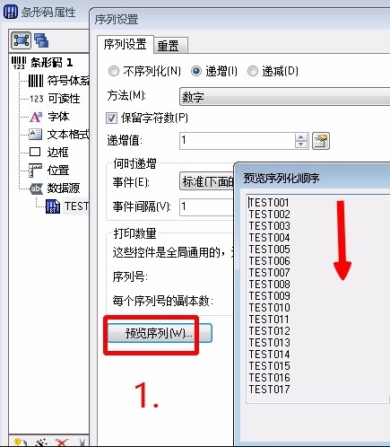 5、设置完毕后,我们点击窗口左下角的“预览序列”按钮,界面上会弹出一个预览序列化顺序窗口,在窗口中我们可以看到递增的标签编号;我们点击窗口右下角的“确定”按钮即可。