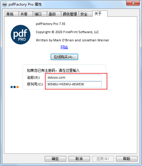 7、在关于界面中,将软件包中的pdffactory pro注册码复制过来;