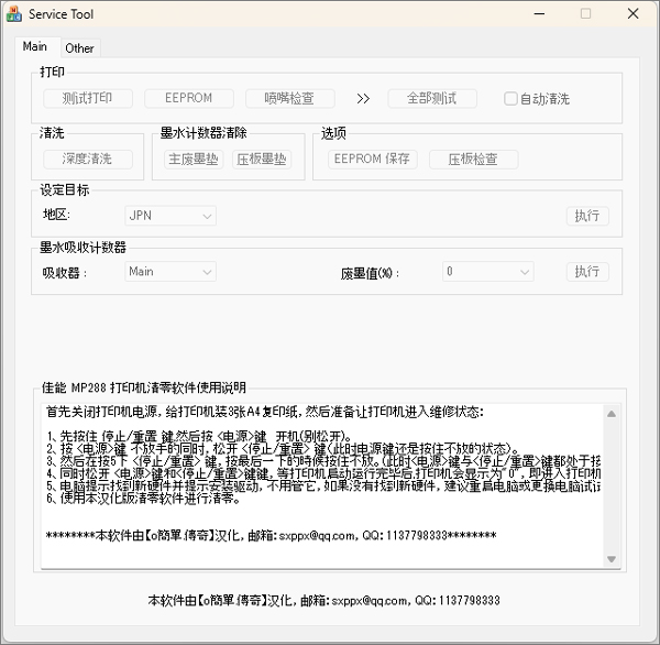 最近我遇到了打印机墨水显示不足的问题,正好找到了这个佳能MP288清零软件。说实话,一开始我还以为要花不少钱换墨盒呢,结果这个小工具完全解决了我的烦恼!软件功能挺多的,比如测试打印、喷嘴检查、深度清洗这些都很实用,特别是清零墨水计数器的功能,让我省了不少钱。