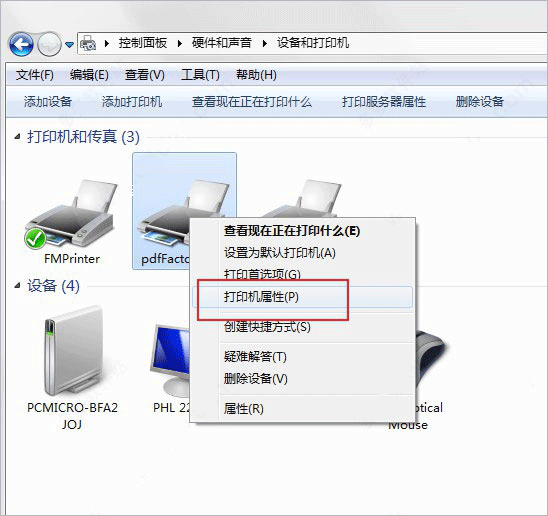 5、进入控制面板-硬件和声音-设备打印机中,可以看到"pdfFactory Pro" 打印机;