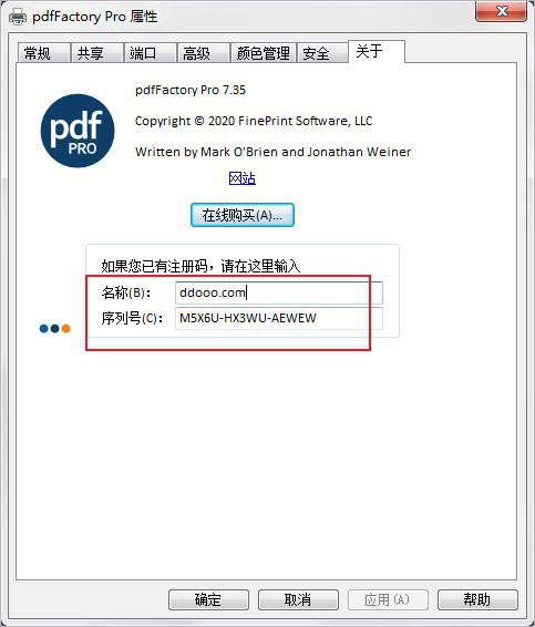 7、在关于界面中,将软件包中的pdffactory pro7注册码复制过来;