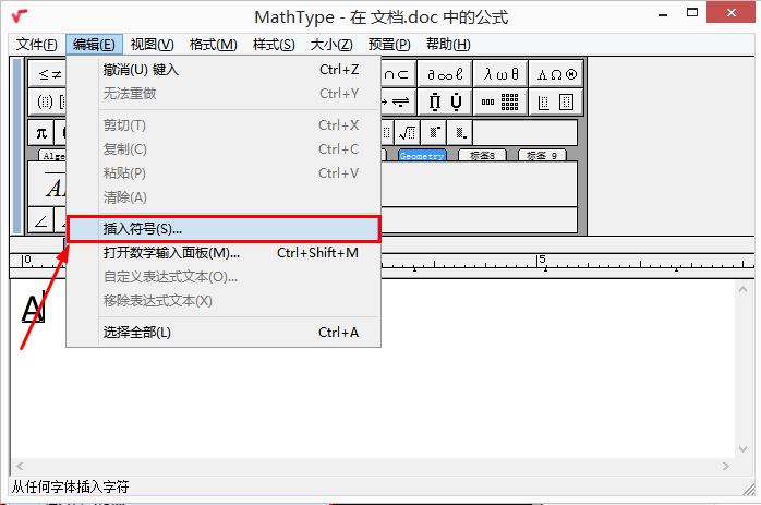 ②首先输入字母“A”,然后点击“编辑”-“插入符号”。