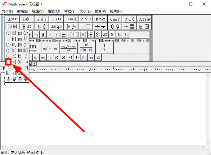 1、打开mathtype,点击第二行第一个括号分割符,会出现一个符号列表,其中红色箭头所示的位置是左大括号。
