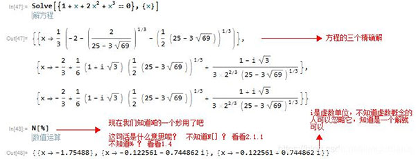 2、方程的求解:解方程需要用到Mathematica的几个内建函数,Slove[等式,{x}],Roots[等式,{x}],FindRoot[等式,{x,x0}],Mathematica总能对不高于4次的函数精确求解,其中Solve和Root用法相同,FindRoot针对解十分困难的方程时,我们通过图像大致知道解的范围,那么我们指定x0,程序会寻找在x0附近的一个解。