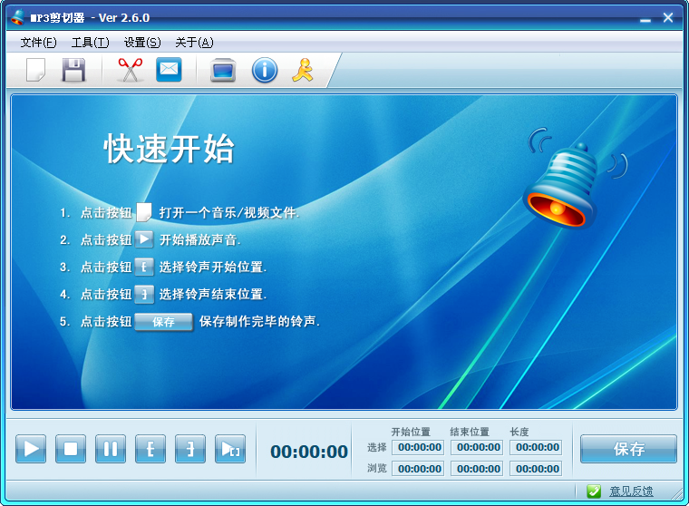 mp3剪切器是一款真正的操作简便且转换速度迅速的mp3剪切工具,全中文界面,非常容易上手,能够帮助用户将音乐或视频文件进行分割,制作成手机铃声或MP3片段。非常适合做铃声制作软件,并且操作很简单,只需要设置需要剪切MP3文件的起点和终点,然后保存就可以了。