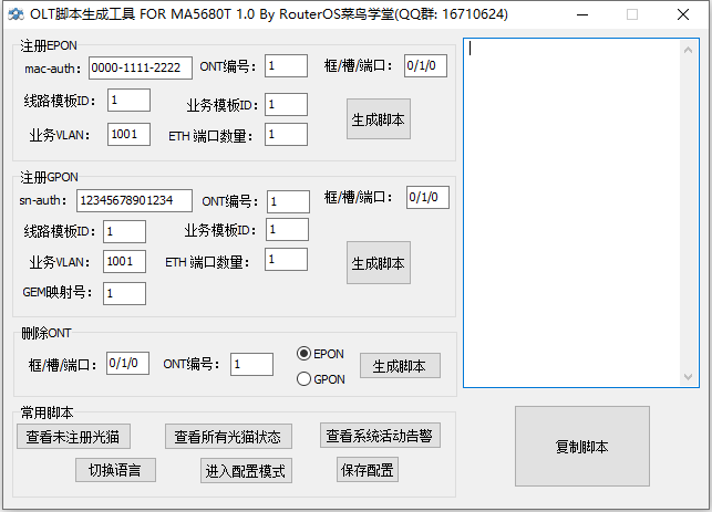 我觉得这个工具特别适合网络维护人员或者刚接触OLT脚本的新手,因为它的操作流程简单明了,基本上点几下就能生成需要的脚本了。而且内置了一些常用的脚本示例,比如查看未注册光猫状态、切换语言这些功能,实用性很强。