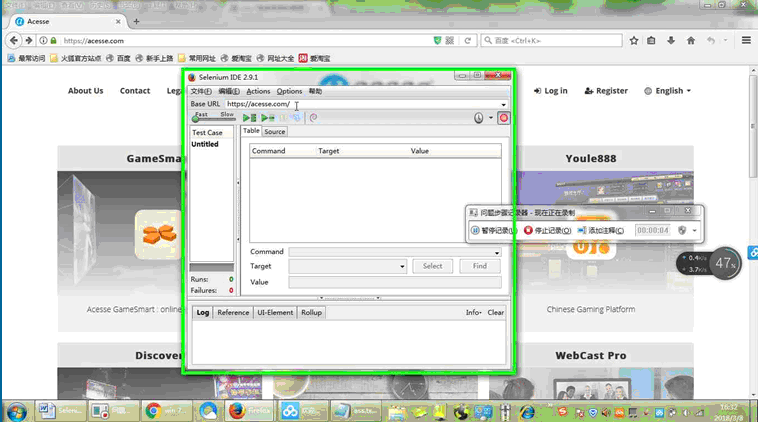2、配置网址并开始记录,在Base URL文本框输入要登录的网址:如https://acesse.com/ ,在“Record (按下按钮)”(位于“Selenium IDE 2.9.1”中)上用户左键单击