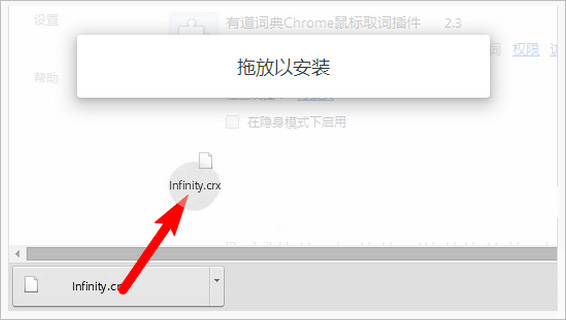 3、把下载的扩展包(Infinity.crx)拖拽到【扩展程序页】(只能是这个页面)