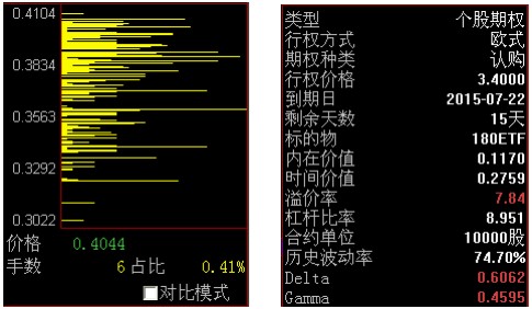 进入标的股票和期权的走势或技术画面,右侧显示了当天该商品的各种信息,我们这里详细介绍期权走势和技术分析画面的十字游标显示的数据情况,股票和指数的信息栏的不在此处介绍期权信息窗口显示数据