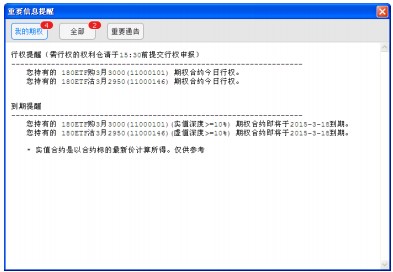 用户在登陆期权宝软件之后,系统还会弹出信息提醒窗口,在这里可以看到持仓期权的一些提醒信息以及营业部