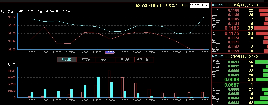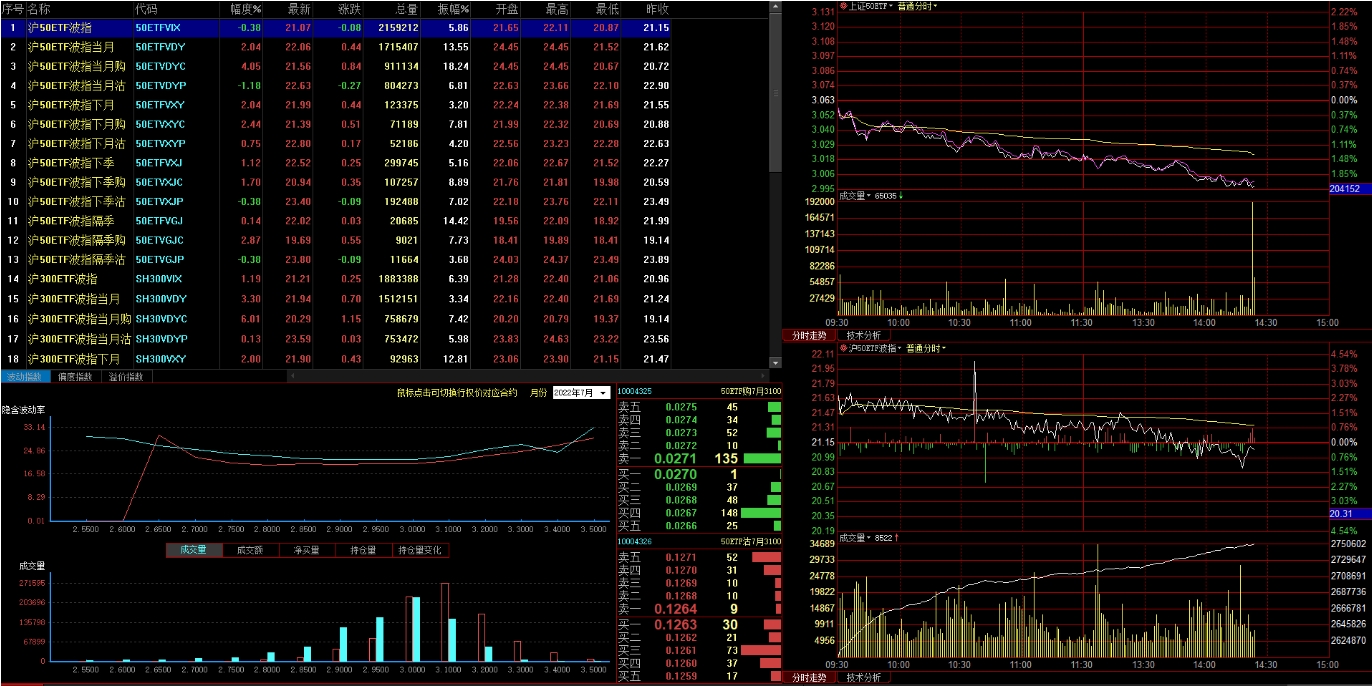 每个月合约的认购认沽隐含波的比较分析;同时可以通过成交量、成交额、净买量、持仓量、持仓量的变化来观察认购和认沽力量对比。也可以通过右键快捷下单对平值合约进行快速开仓交易。
