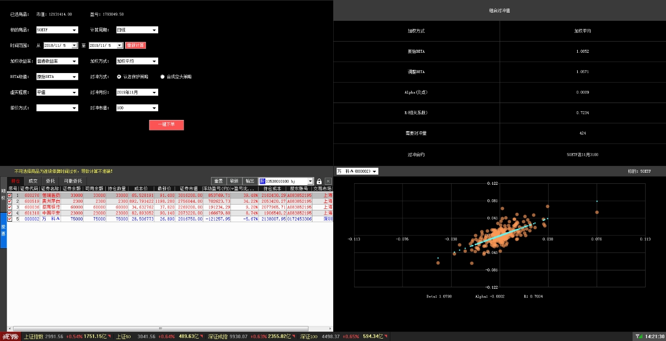 首先用户需同时登录期权和股票账户;然后用户进行组合构建:勾选需要进行对冲的股票(如下图);接下来用户需要对“对冲标的”、“计算周期”、“时间范围”、“加权方式”、“beta取值”、“对冲方式”、“对冲市值”、“虚实度”、“对冲月份”以及“对冲市值”进行选择。设置完成后,在画面的右上方系统会计算出本次对冲的beta值,需要对冲张数,对冲合约。按“一键下单”弹出委托页面,就可以完成对冲操作,用户可以在期权持仓页面进行调仓操作。
