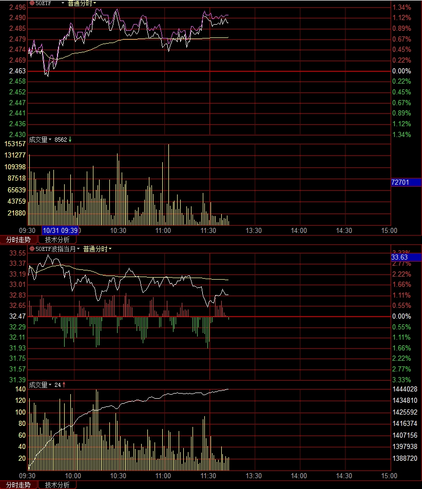 该画面提供用户可以同时间刻度来观察标的变化对波动指数的影响。用户可以通过切换成k线或者分时走势来比较标的对波指的影响。