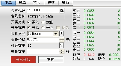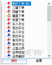 - 在交易界面的左侧栏选择委托类型,包括:三键下单、四键下单、快速下单、买入开仓、卖出开仓、买入平仓、卖出平仓、备兑开仓、备兑平仓等多钟下单选择模式。