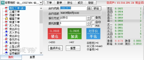 - 点击钱龙期权宝界面上方的菜单栏,选择点击按钮,这时整个系统界面的下方弹出普通模式的交易界面,如下图: