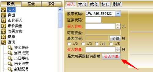 3、进入委托页面填写证券代码、买入价格、数量,点击“买入下单”,当股票价格达到你设置的数字就能成交