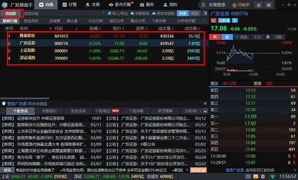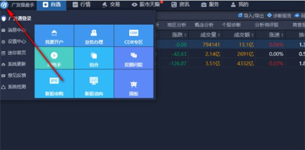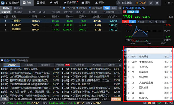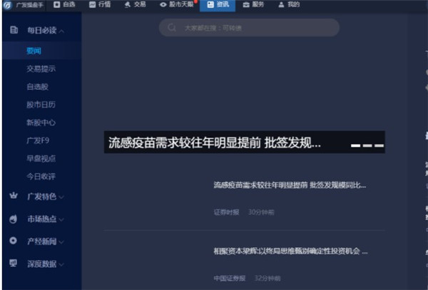 8、点击咨询按进入软件每日必读页面,可以浏览交易提示、自选股和广发f9等信息