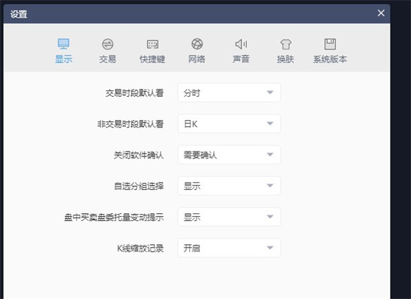4、点击设置按钮弹出软件设置弹框,该弹框可以设置软件显示、软件交易和软件快捷键设置
