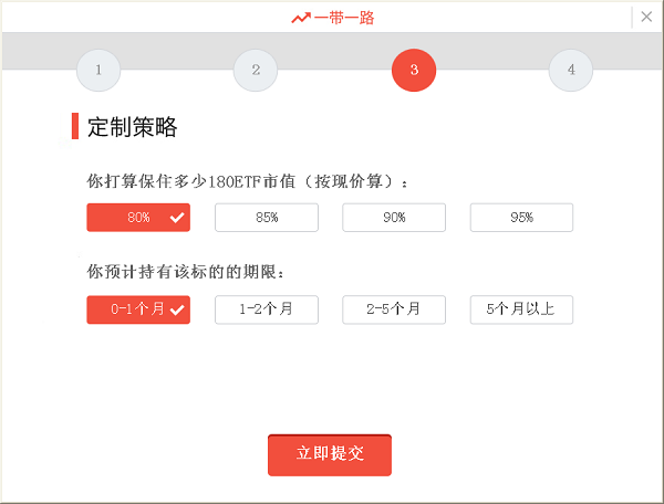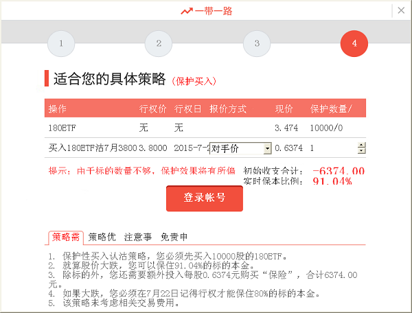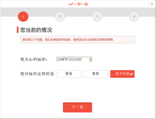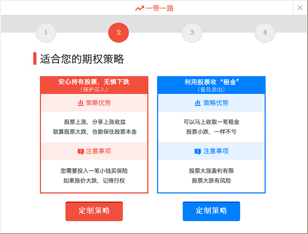 为了方便初入门的期权投资者使用期权宝,我们设计了具有按步骤按需求引导设置下单的“一带一路”功能,让您投资期权如网上购物一般轻松。