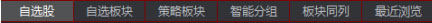 自选菜单包括自选股、自选板块、策略板块、智能分组、板块同列、最近浏览界面,