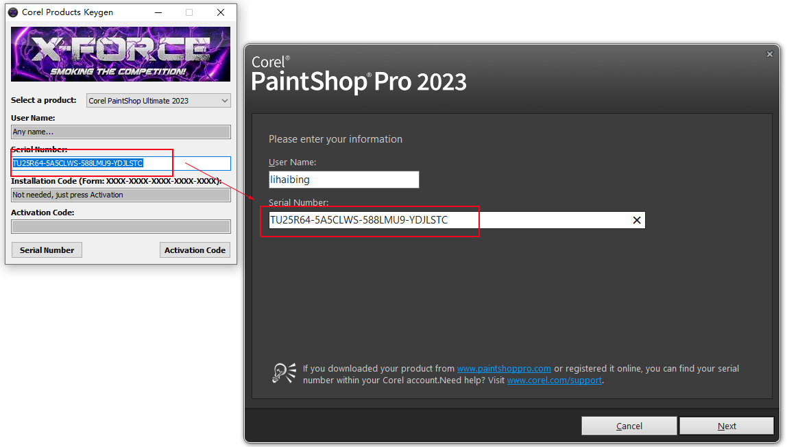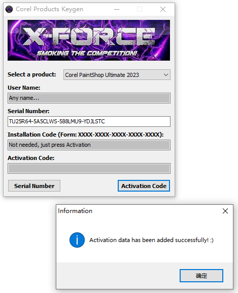 2、将keygen-XFORCE激活文件解压出来,双击xfpsp2023.exe打开,选择corel paintshop Ultimate 2023;得到serial number;