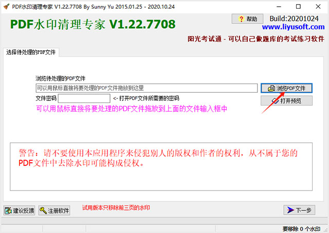 1、运行PDF水印清理专家,选择一个要做水印去除处理的PDF文件