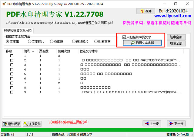 2、点击“扫描文字水印”,扫描PDF文件中所有可能的文字水印字符串