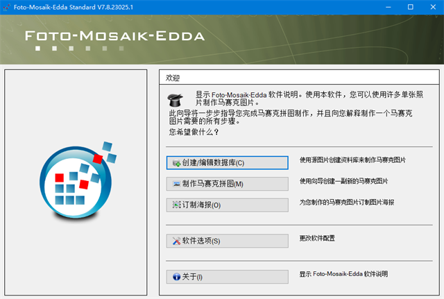 foto-mosaik-edda是一款拥有蒙太奇效果的海报制作软件,软件能够通过多张不同的小图片合成一张蒙太奇效果的拼图图片,简单的说就是马赛克拼图效果图,然后制用成海报宣传或网站宣传广告图,对于经常需要做海报的人员来说,这款软件决定是再合适不过的了,并且软件的操作的非常简单,就算是新手用户也可以通过自带的教程提示来完成操作,有需求的朋友可以来下载体验。