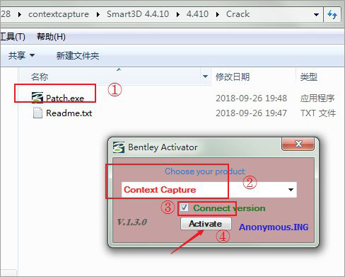 4、然后运行Crack文件夹中"Patch.exe",选择ContextCapture,勾选connect version项,单击Activate进行处理;