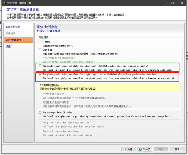 注意,若在3、4步骤之间,在surveys一栏添加了控制点,则选择使用控制点坐标(绿色框),如果没有添加控制点,会默认选择使用照片坐标(红色框)。这里我们没有添加控制点,默认选择使用照片坐标。直接点击下一步进入设置: