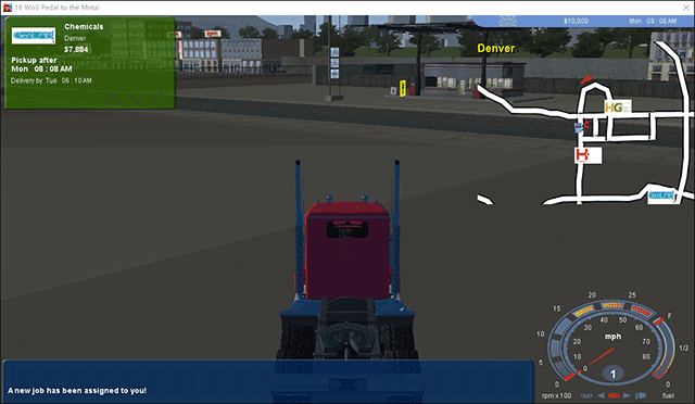 First job assignment picked up卡车接驳好了之后,你就得尽快地运送货物了。请看屏幕左上角的蓝色方框。你会看到你所运货物的公司标识,它的所在地,例如:Indianapolis。这次运输的最终期限,以及为了让你能准时完成任务,还有任务的倒计时。