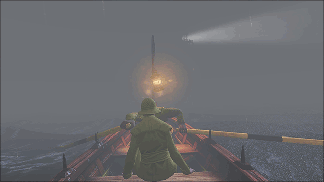 6、接下来,就是开始正式冒险了,玩家首先乘坐小船前往一座灯塔,前面2位划船的人是带着特殊使命护送侦探布克(玩家)来到灯塔的线索人物,玩家可以好好听听他们的对话,借此对游戏世界观进行补充;